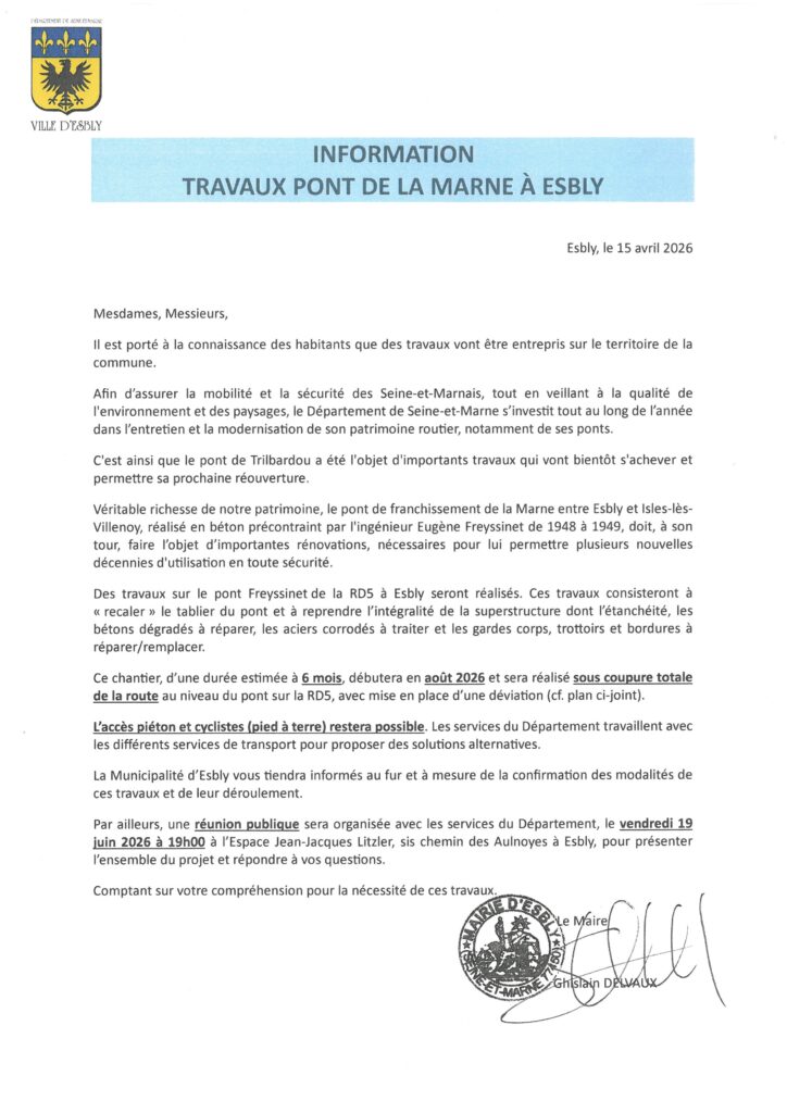 Une réunion publique sera organisée avec les services du Département, le vendredi 19 juin 2026 à 19h00 à l’Espace Jean-Jacques Litzler, sis chemin des Aulnoyes à Esbly, pour présenter l’ensemble du projet et répondre à vos questions.