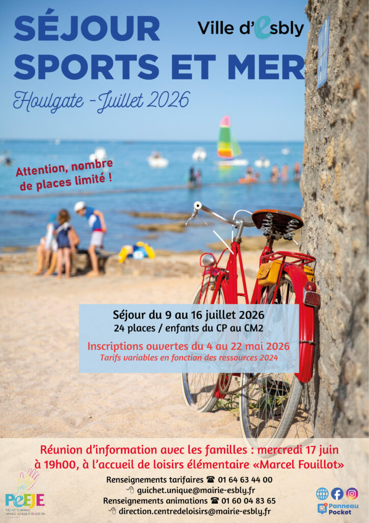 La Municipalité d’Esbly propose cette année un séjour « Sports et Mer » destiné aux enfants d’âge élémentaire, à Houlgate en Normandie du 9 au 16 juillet 2026.